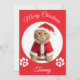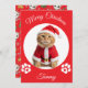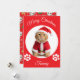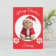 Una encantadora tarjeta de Navidad personalizable que presenta una foto de primer plano de un adorable gato atigrado naranja vestido con un traje y sombrero completos de Santa Claus, enmarcado por un círculo blanco. La tarjeta tiene un fondo rojo brillante con la frase "Feliz Navidad" en una elegante fuente de escritura y espacio para un nombre personalizado (como 'Tommy') en la parte inferior. El diseño se completa con dos huellas de patas blancas, cada una con un pequeño corazón rojo. Esta tarjeta es perfecta para que los dueños de gatos envíen saludos navideños desde su querida mascota.