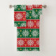 Scandinavian-inspired faux-knit pattern of snowflakes, diamonds, and festive stripes in red, green, white, and gold.