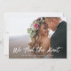 Esta sencilla y elegante tarjeta de anuncio de fuga de novios presenta una foto personal de la boda en la parte delantera, con las palabras "nos casamos" en una fuente manuscrita de moda y blanca. La parte trasera de la tarjeta tiene espacio para otra foto, además de espacio para detallar los pormenores de la fuga o proporcionar detalles para una recepción o celebración posterior a la boda. Un diseño minimalista moderno que es la forma perfecta de hacer saber a amigos y familiares que están recién casados.