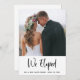 Estas sencillas y elegantes invitaciones para el anuncio de boda y fiesta posterior a la boda presentan su foto personal en la portada, con una tipografía manuscrita negra de moda que dice "nos fugamos". Hay espacio para agregar sus nombres y la fecha. Una apariencia fresca y moderna que es la forma perfecta de hacer saber a amigos y familiares que están casados e invitarlos a su fiesta de celebración posterior a la boda.