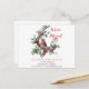 Clásica corona de Navidad, y tarjeta roja en un fondo blanco.