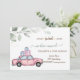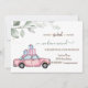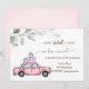 Coche rosa de acuarela con regalos y hojas sobre fondo blanco.