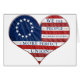 Colorida bandera estadounidense roja, blanca y azul original de 13 estados Betsy Ross en forma de corazón, con la primera línea del Preámbulo de la Constitución de los Estados Unidos de América.