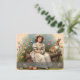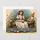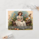 Un joven chica vestido de azul con esposas blancas se sienta en un banco de madera en medio de un jardín florido. Ella está leyendo una pequeña carta mientras las mariposas vuelan a su alrededor. Una liebre y un pequeño conejo se sientan a su lado, mientras que otras flores de primavera florecen en colores cálidos en el fondo. Las palabras "Feliz Pascua" le dan a la foto un toque festivo.