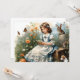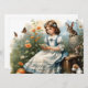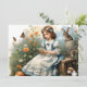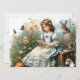 Un joven chica vestido de azul con esposas blancas se sienta en un banco de madera en medio de un jardín florido. Ella está leyendo una pequeña carta mientras las mariposas vuelan a su alrededor. Una liebre y un pequeño conejo se sientan a su lado, mientras que otras flores de primavera florecen en colores cálidos en el fondo. Las palabras "Feliz Pascua" le dan a la foto un toque festivo.