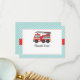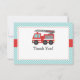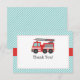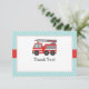 ¡Una nota de agradecimiento para acompañar la fiesta de cumpleaños del camión de bomberos! El diseño cuenta con un camión de bomberos rojo que tiene franjas blancas en su lado y una escalera retráctil con manguera. Un patrón de franjas inclinadas azul claro para el fondo. Una paleta de colores de rojo, blanco, azul y gris.