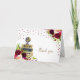 Nota de agradecimiento para despedida de soltera con tema de viaje en tonos burdeos y dorado con maletas, un globo terráqueo, flores y confeti divertido.