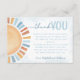 Esta tarjeta de agradecimiento para el brillo del sol está diseñada para coincidir con nuestra colección de acuarela Sunshine! Esta temática veraniega es perfecta para cualquier género, niño o chica, con relajantes tonos azules, naranjas y amarillos. Este diseño presenta un fondo y un sol acuarela, además de una parte posterior que combina a la perfección. Para editar con los detalles del evento, haga clic en "Personalizar" o "Detalles", a continuación, elimine el texto prerelleno y reemplácelo por el suyo propio. Por favor, no dude en contactarnos si tiene alguna pregunta.
