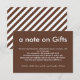 Presentación de la Tarjeta de Gabinete de Regalos, una adición elegante y práctica a la Colección de Armonía Rústica. Esta tarjeta rectangular presenta un rico fondo marrón con sutiles rayas blancas, que recuerdan el encanto rústico de la temática boda. En la parte delantera de la tarjeta, un mensaje de la pareja da la bienvenida a los clientes. Se les pide gentilmente que visiten el sitio web del boda de la pareja para la opción de comprar un regalo, si así lo desean. La dirección del sitio web se muestra de forma destacada en blanco con el fondo marrón, lo que asegura que sea fácil de leer y acceder. La parte trasera de la tarjeta está decorada con sencillez con motivos de rayas marrones y blancas, añadiendo un toque de elegancia rústica a esta práctica tarjeta de presentación. Diseñada con cuidado y atención a los detalles, esta tarjeta de presentación es una gentil sugerencia para sus huéspedes, manteniendo la elegancia y armonía de su tema boda.