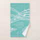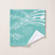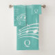 Moderna y elegante cortina de ducha de estilo verde azulado cristiano Scripture, diseñada con notas musicales. Hay un texto de personalizable que dice "DEJEN TODO LO QUE TENGA RESPIRACIÓN A JEHOVAH", que se basa en el Salmo 150 y que puedes personalizar para que se ajuste a tus necesidades. En la esquina inferior derecha hay un personalizable MONOGRAM.