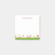 ilustracion tulipán de tulipanes a la sombra de rosa y amarillo en la hierba verde en el fondo de las notas. Personaliza tu nombre o mensaje con una fuente púrpura profunda.
