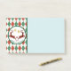 Sticky nota con un círculo que dice "Feliz Navidad" dentro en texto curvo. Diseñado con un ilustracion de 2 ciervos Navidades saltando. Los ciervos están hechos de leñadores rojos y negros, con un poco de corazón entre ellos. Las decoraciones navideñas falsas purpurinas de oro cuelgan desde arriba. El fondo es un patrón de argyle rojo y verde.