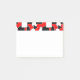 Este bloc de notas Post-It tiene un diseño Bauhaus de triángulos, círculos, rectángulos y pentagones en blanco y negro sobre un campo de rojo.