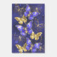 Composición de lujosas mariposas de zafiro y joyas de oro sobre fondo de textura azul.