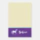 Notas pegajosas de gran tamaño con el borde inferior decorado con un unicornio color bonito pintado en suaves acuarelas pastel de rosa, violeta y azul. El texto de la tipografía inspiradora dice Creer en un tipo de letra moderno con una estrella encima de la letra i. Sobre un fondo púrpura real. El resto del fondo es de color tostado y suave.