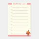 Bonitas notas Post-it con lista de compras personalizada y cuenco de frutas de vidrio con base en color crema.