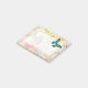 Nota pegajosa diseñada con una elegante mariposa verde. Marco blanco semitransparente con un borde dorado sobre un patrón de collage vintage con rosas rosas rosadas delgadas y hojas de oro verde con un aspecto anticuado poco original.