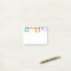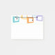 Este bloc de notas Post-It tiene un diseño de rectángulos que se estiran en un extremo en colores vivos, naranja, verde, verde azulado, morado, azul, rosa y amarillo, con líneas atómicas que los atraviesan.