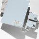 Notepad moderno, elegante y de moda con un color azul polvoriento con monograma tostado y tipografía de nombre blanco. Los colores se pueden personalizar a su elección