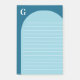 Billete pegajoso monogramado y alineado en dos tonalidades de azul, con tu inicial en la parte superior y una forma de arco azul claro con líneas blancas prácticas para tu toma de notas, para hacer listas, y recordatorios! Talla azul post-it personalizada con tu monograma, en dos matices diferentes, uno azul más profundo y otro azul más claro, y con una página alineada.