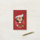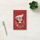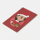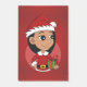 Diseño con el ilustracion de una linda sonriente chica feliz con el pelo castaño largo, lleva disfraz rojo y blanco de Santa Claus y tiene un regalo; vacaciones de Navidades con antecedentes rojos