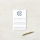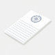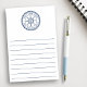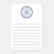Notas pegajosas con un emblema azul oscuro y elegante de la rueda y cuerda del barco con el nombre del barco personalizado y puerto de saludo. Debajo hay líneas para escribir.