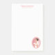 Notas pegajosas personalizado con tu nombre y título u otro texto con un ilustracion de una novia sonriente sosteniendo un ramo de flores con su elegante vestido boda blanco y usando un velo. Se coloca dentro de un marco ovalado rosado con un borde de vieira.
