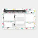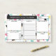 Planner diario retro con un patrón geométrico de triángulos en turquesa, negro, rosa y amarillo contra un fondo blanco. Personalice su nombre con una etiqueta negra en la parte superior. Puede agregar fecha a mano. Todas las categorías — importantes, comidas y aperitivos, para hacer lista, pensamientos felices, fitness — son personalizables para satisfacer sus necesidades. En la caja de comidas y aperitivos hay ocho gotas de agua para hacer un seguimiento de su consumo diario. La lista de tareas pendientes incluye una lista con diez casillas de verificación para que pueda desproteger fácilmente las tareas finalizadas.
