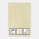 Notas post-it 4x6. Un lindo gráfico con 3 cuadrados y dentro de cada cuadrado es un ilustracion separado. Un delfín azul saltando (con diseños decorativos en su cuerpo) con "paz" escrito debajo. Una linda conejita al estilo kawaii sosteniendo un chupete con forma de corazón con "Amor" escrito debajo del gráfico. Y finalmente un gracioso unicornio bailando y retorciéndose con alegría con la palabra "demencia" escrita debajo. Se establece en un fondo de color pergamino.