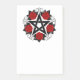Pentagrama negro con patrón, decorado con rosas rojas florecidas con hojas sobre fondo blanco. Estilo de tatuaje.