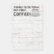 Esta es una de mis citas de café favoritas y la he puesto en estas toallas de 4"x6". COSAS QUE HACER HOY. EN PRIMER LUGAR, COFFEE! está colocado contra una pared de ladrillo blanco. En la esquina superior derecha hay una taza de café humeante.