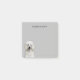 Imagen de un lindo perro tipo Poodle blanco y esponjoso con un oso de peluche cortado y colocado en la esquina inferior izquierda, sobre gris claro sólido. Personalice su nombre o mensaje con una letra minimalista negra.