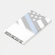 Este diseño incluye una bandera de la fuerza policial con rayas blancas y negras, y una delgada franja azul. En la parte inferior hay un lugar para el personalizar con el nombre del oficial o la estación de policía para la que trabajan.