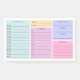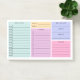 Notepads para la planificación de su educación diaria en casa, con un horario de 7:00 a 18:00 h, lista de tareas con casillas de verificación prácticas, espacio para planear comidas—desayuno, almuerzo, aperitivos—y una caja para añadir notas. La gráfica de escolarización en el hogar incluye cajas de color rosa, verde menta, morado y amarillo. Añadir nombre y fecha a mano.