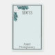 Flores elegantes y blancas del ranúnculo y notas pegajosas de la libreta verde del follaje con nombre personalizado.