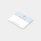 Notas personalizadas post-it con un elegante símbolo de cadáceo rojo con las letras R N a ambos lados. Diseño minimalista sencillo. Fondo de color blanco y azul dividido.