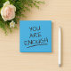 Eres suficientes notas adhesivas positivas. Notas azules con un mensaje en negrita "Eres suficiente" con un subrayado impreso en todo su largo. Utiliza estas maravillosas notas positivas para recordarte a ti mismo que eres lo suficientemente hermoso, lo suficientemente inteligente, lo suficientemente fuerte, lo suficientemente bueno y simplemente lo suficiente en todo. Es una gran herramienta para usar en contra de la idea de que no somos lo suficientemente buenos y no somos dignos de felicidad y cosas buenas en la vida. Además de usarlas en el desarrollo personal, también puedes usarlas para hacer actos de bondad al azar. Colócalas en varios lugares y deja que tus amigos, compañeros de escuela y también extraños las encuentren y se sientan animados y merecedores.