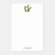 Este panel de notas Post-It incluye un nombre guionado verde en la parte inferior de la página y un conjunto de flores de tulipanes rojos en la parte superior.