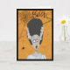 ¡Ella vive! ¡Esta novia linda y divertida de Frankenstein animará para arriba su Halloween! La novia del dibujo animado mira en una araña no-tan-asustadiza contra un intrépido, fondo veteado naranja, termina con la tela de araña y el "ABUCHEO!" enredado en la tela. Dentro del saludo simple "feliz Halloween" transporta su saludo del día de fiesta. Diseñado especialmente para los estudios de la cabra Bewildered.