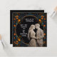 Invitación de boda personalizada de novia y novio en negro con dorado con un borde de flores.