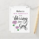 Expresar sus sentimientos acerca de su amistad con este diseño de tipografía caligráfica frontal personalizado que presenta el mensaje: "NOMBRE PERSONALIZADO AQUÍ, nuestra amistad es una bendición de Dios". El diseño aparece en letras negras sobre fondo blanco y se acentúa con una hermosa flor morada en la esquina inferior izquierda del diseño.
