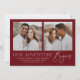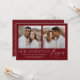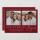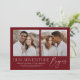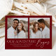 ¡Comparte la noticia de tu compromiso con el estilo con estas modernas invitaciones de compromiso fotográfico! La invitación muestra dos de tus fotos favoritas de compromiso cuadrado con la frase "Nuestra aventura empieza" con letras blancas de moda sobre un fondo borgoñoso. Personalice la parte delantera de la invitación agregando sus nombres y detalles adicionales. La parte posterior de la invitación presenta un bonito patrón geométrico.