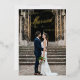 Una tarjeta de vacaciones elegantemente dorada con lámina de oro para celebrar sus primeras fiestas como pareja casada. Su foto favorita está superpuesta con la felicitación "nuestra primera Navidad de casados" en letra de oro. Firma con tu nuevo apellido de casada en letra serif. En el reverso hay un patrón de bayas y hojas de acuarela.