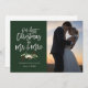 Tarjeta de vacaciones moderna con las palabras "nuestra primera Navidad como Sr. y la señora". en un guión moderno escrito a mano con la foto mostrada a la derecha. Gráficos ©HuckleberryHearts