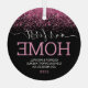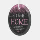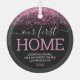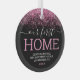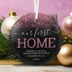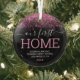Nuevo adorno de navidad de cristal en casa con un fondo negro de moda, un elegante diseño de cascada purpurina rosa, el lindo dicho "nuestra primera casa", tu(s) nombre(s), tu nueva dirección y el año.