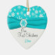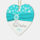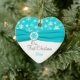 Recuerde su día especial con esta turquesa hermosa y copos de nieve blancos, ornamento de cerámica en forma de corazón con medallón azul de la cinta y del copo de nieve de la aguamarina un FALSO. Usted puede modificar el texto para requisitos particulares para decir lo que usted desea. También hace juego la turquesa y los copos de nieve blancos que casan la colección mostrada abajo.