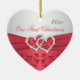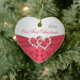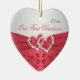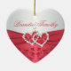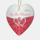 Este ornamento en forma de corazón coralino del ceramice floral rosado y gris tiene falsas cintas coralinas y corazones unidos jewelled purpurinoso y hace juego la invitación del boda mostrada abajo. Haría un recuerdo agradable de su día especial, o un gran regalo para los recienes casados.