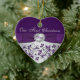 Este ornamento en forma de corazón de cerámica floral, de color morado y plateado, tiene una cinta y un arco de color púrpura IMPRESIONADOS con un FAUX plateado grabado con un medallón ornamentado. Haría un buen recuerdo de tu día especial, o un gran regalo para los recién casados, o cambiaría el texto y les daría como regalo a los asistentes de tu fiesta de boda o a las personas especiales como favores. Si necesita ayuda para personalizar esto, o si desea cambiar algo, envíe un correo electrónico a niteowlstudio@gmail.com.