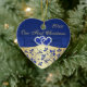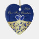 Este ornamento de corazón de cerámica floral azul real y dorado tiene una cinta azul IMPRESIONADA y un arco con un par de purpurinas FAUX y joyas de diamante IMPRESIONADAS que se unen a sus corazones. Haría un buen recuerdo de tu día especial, o un gran regalo para los recién casados, o cambiaría el texto y les daría como regalo a los asistentes de tu fiesta de boda o a las personas especiales como favores. Si necesita ayuda para personalizar esto, o si desea cambiar algo, envíe un correo electrónico a niteowlstudio@gmail.com.