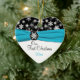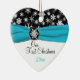 Recuerde su día especial con estos hermosos copos de nieve en blanco y negro, adornos cerámicos en forma de corazón con una cinta azul acuática FAUX y medallón de copo de nieve. Puedes personalizar el texto para decir lo que quieras. También coincide con la colección de bodas de copos de nieve en blanco, negro y agua que se muestra a continuación.